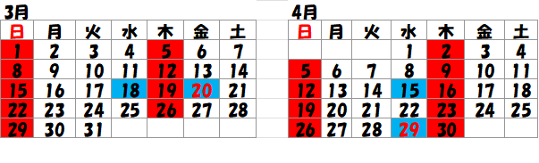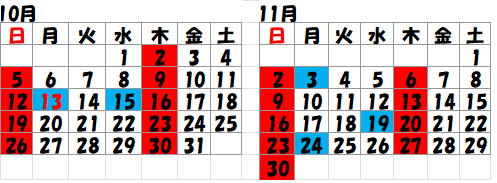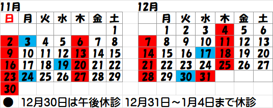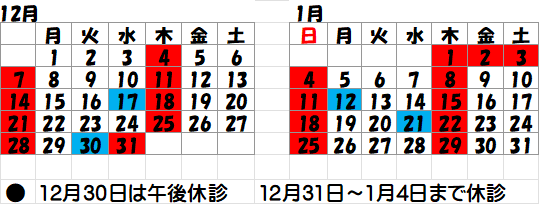 ●休診日カレンダー(赤□:休診 青□:午前診療 緑□:午後診療)